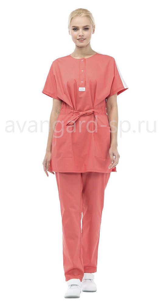 Комплект из блузы и брюк. Блуза-туника удлиненная прямого силуэта с цельнокроеными короткими рукавами. Застежка на планку с кнопками спереди. На плечах отделка из широкой тесьмы. В нижней части блузы накладные карманы. По талии спинки эластичная кулиса на резинке. По талии переда полупояса для регулировки объема. По низу блузы, по бокам, небольшие разрезы. Брюки прямого силуэта, с эластичным поясом и боковыми карманами.